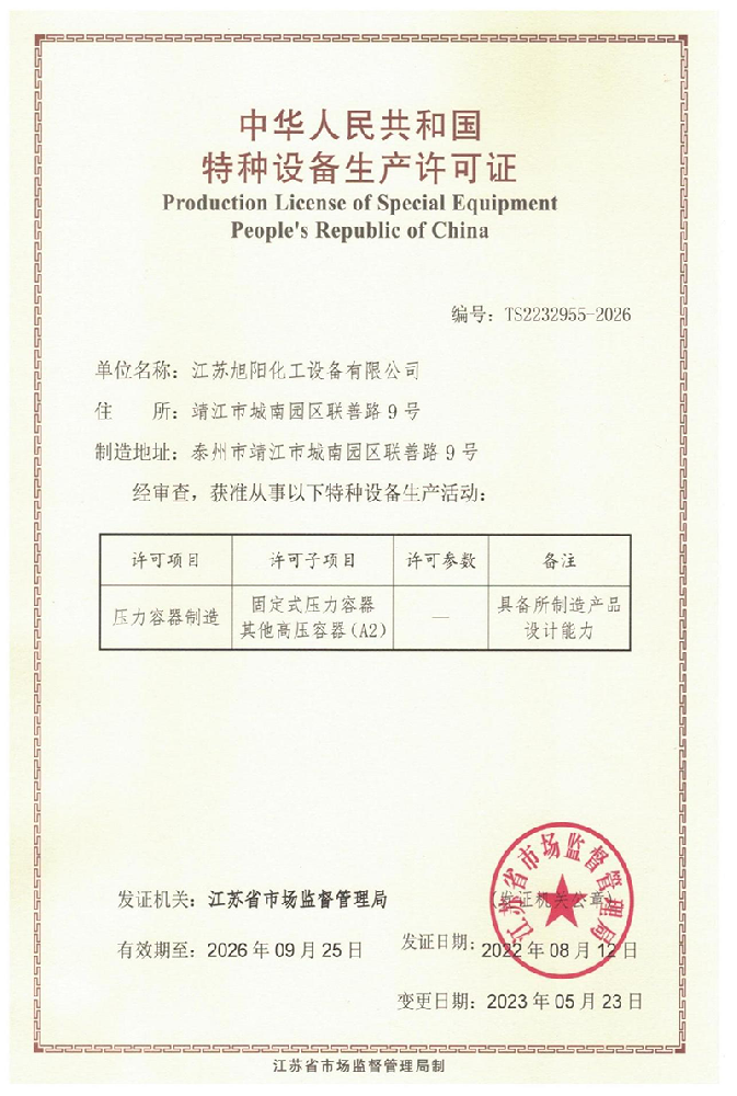 Jiangsu Xuyang Chemical Equipment Co., Ltd. is a high-tech enterprise integrating research and development, production and import and export trade, specializing in the design and manufacture of various chemical, environmental protection, pharmaceutical, fermentation, food, new materials, lithium and other projects and the manufacture of pressure vessels.